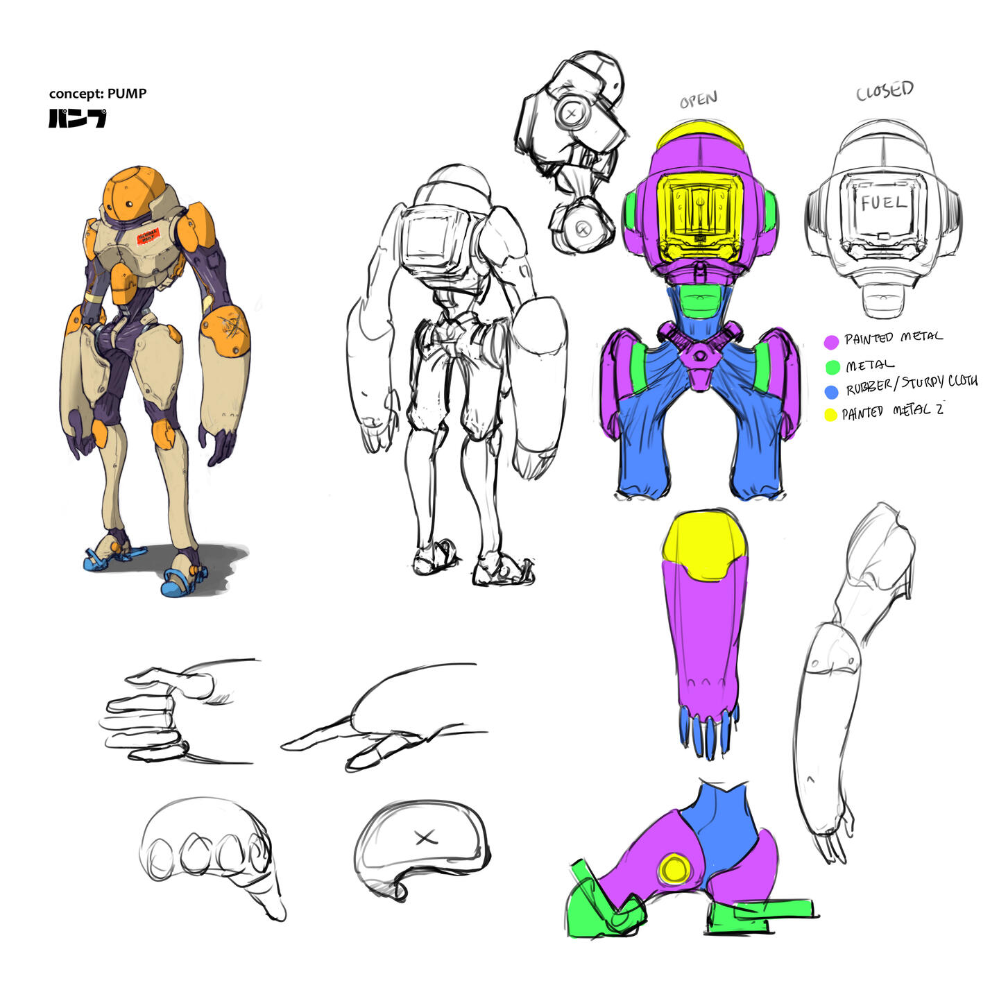 Pump was a design originally created by Yutaka Toguchi. The Robot, "Pump" was recreated based off the concept art Toguchi originally made and found on artstation.